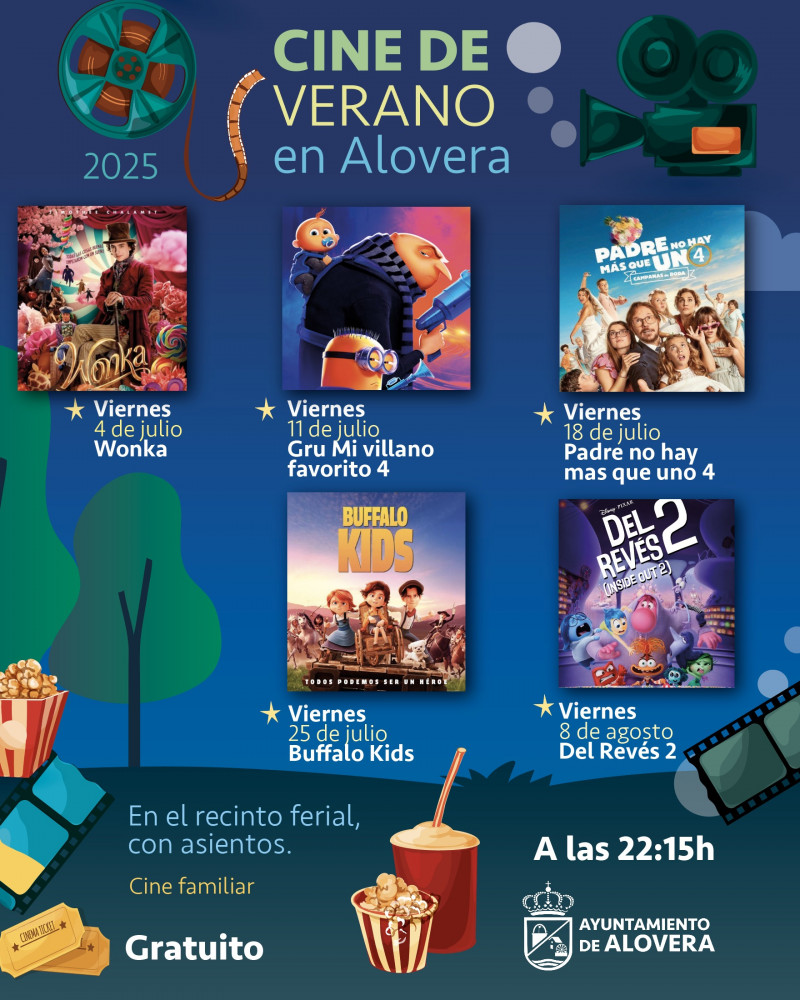 Las proyecciones, también de carácter gratuito, se celebran los viernes en el recinto ferial a partir de las 22:15 horas, siempre hasta completar aforo. Aunque la primera sesión prevista para el 4 de julio con la película Wonka tuvo que ser suspendida por motivos de seguridad debido a las recomendaciones tras un incendio en la zona, el resto del calendario sigue su curso con películas para todos los gustos: