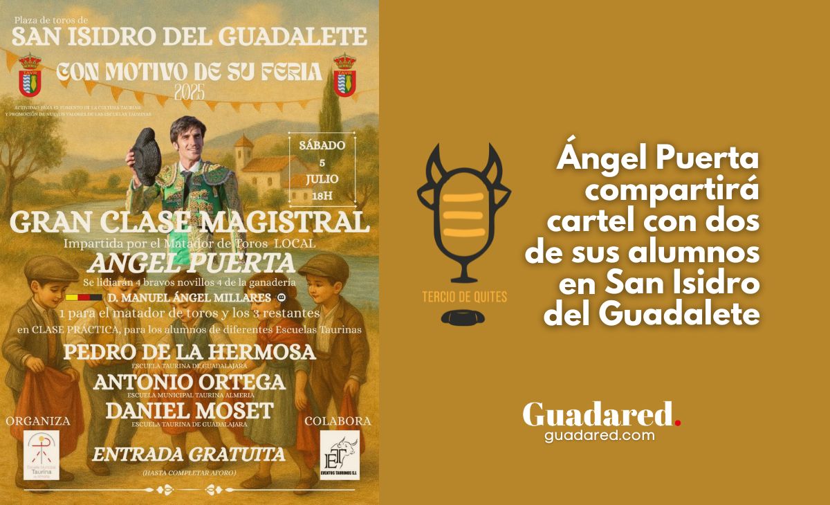 La plaza de toros de San Isidro del Guadalete acogerá el próximo sábado 5 de julio, a las 18:00 horas, una jornada muy especial para los aficionados: una clase magistral de toreo en la que el matador Ángel Puerta, profesor de la Escuela Taurina de Guadalajara, hará el paseíllo junto a dos de sus discípulos, Pedro de la Hermosa y Daniel Moset.