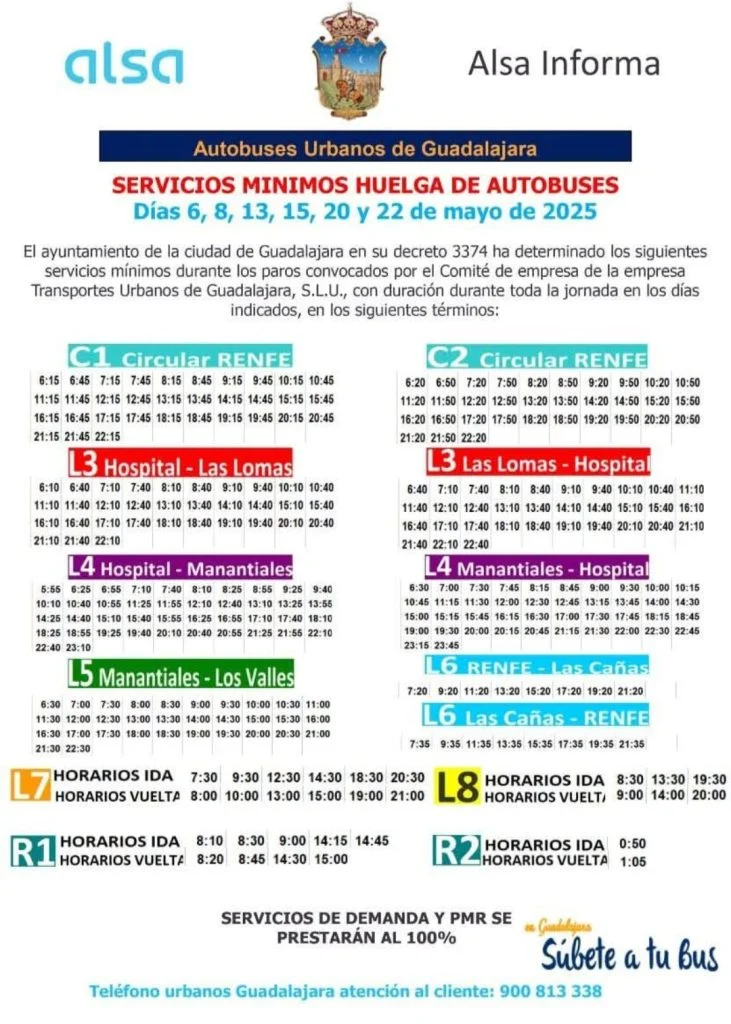 Hoy, 6 de mayo de 2025, comienza oficialmente la huelga de autobuses urbanos en Guadalajara tras fracasar las negociaciones entre la empresa ALSA y los representantes de los trabajadores. Los paros están convocados para los días 6, 8, 13, 15, 20 y 22 de mayo, afectando al transporte público todos los martes y jueves del mes.