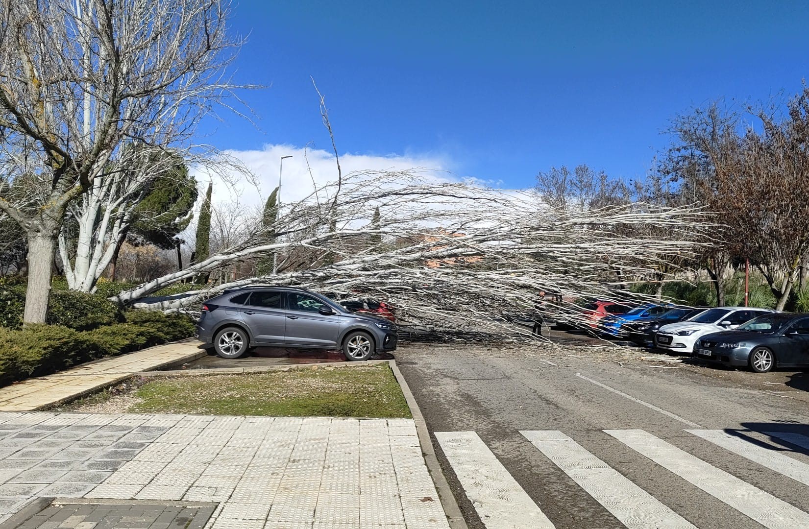 A lo largo del día, la Policía Local de Guadalajara atendió cerca de 50 avisos, en su mayoría por árboles y ramas desprendidas. En cinco de los casos, la caída del arbolado provocó daños materiales en vehículos, aunque sin consecuencias para las personas. También se actuó por contenedores volcados, desprendimientos de elementos de fachadas, carteles y otros objetos desplazados por el viento.