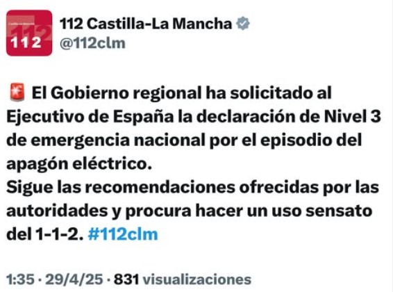 Haz un uso responsable del 1-1-2 hasta que se normalice la situación. #112clm— 112 Castilla-La Mancha (@112clm) April 28, 2025