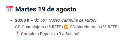 El plato fuerte del verano será el Trofeo Campiña, que este año celebra su cincuentenario con un duelo muy especial frente al CD Guadalajara, equipo vecino y rival con el que se conmemora medio siglo de historia del torneo estival. El encuentro tendrá lugar el martes 19 de agosto en La Solana, coincidiendo con la víspera del pregón de las Fiestas de Agosto 2025 de Marchamalo.