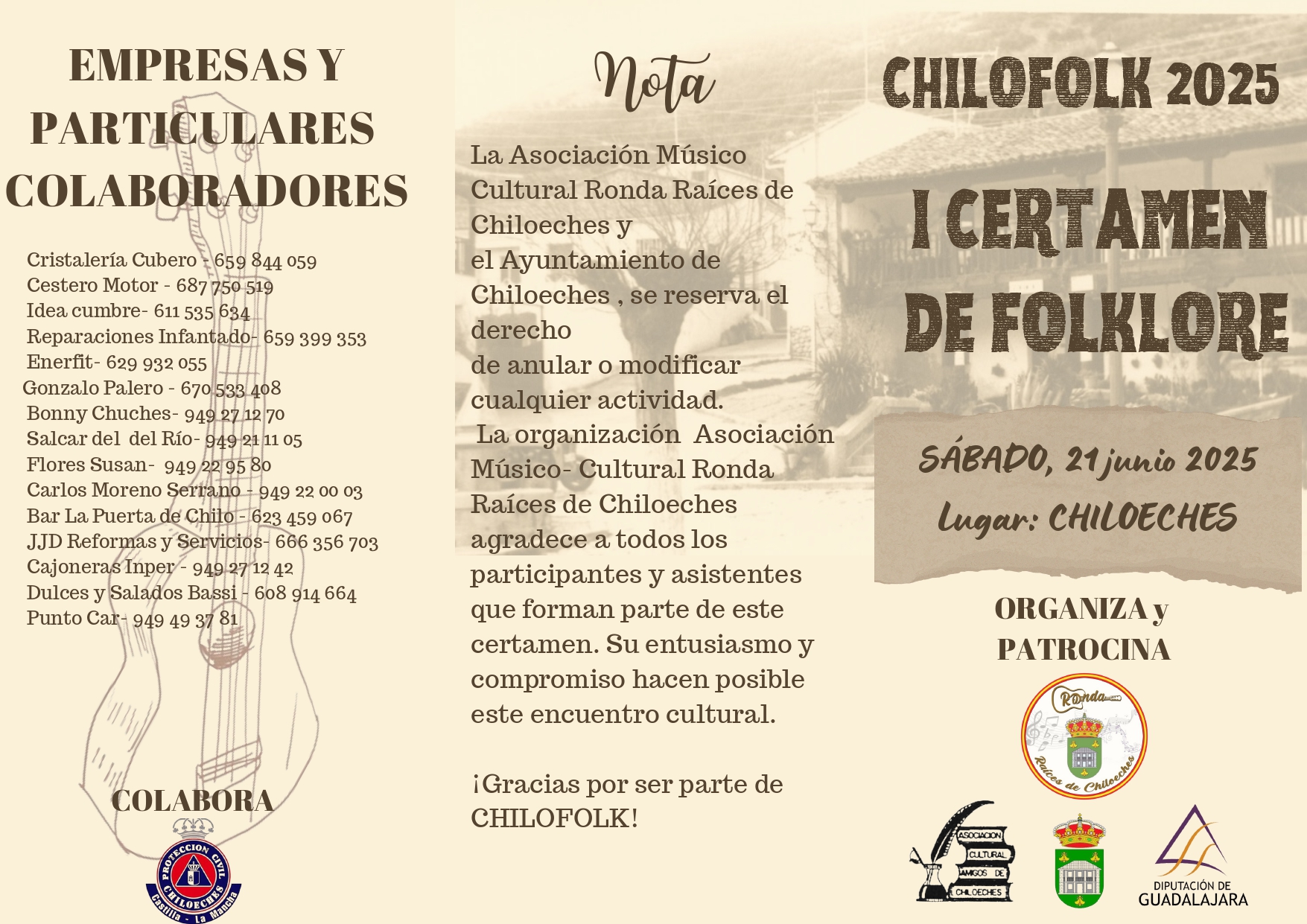 Organizado por la Asociación Músico-Cultural Ronda Raíces de Chiloeches, con el apoyo del Ayuntamiento de Chiloeches y la Diputación de Guadalajara, CHILOFOLK 2025 aspira a consolidarse como una cita anual de referencia en el calendario cultural de la región.