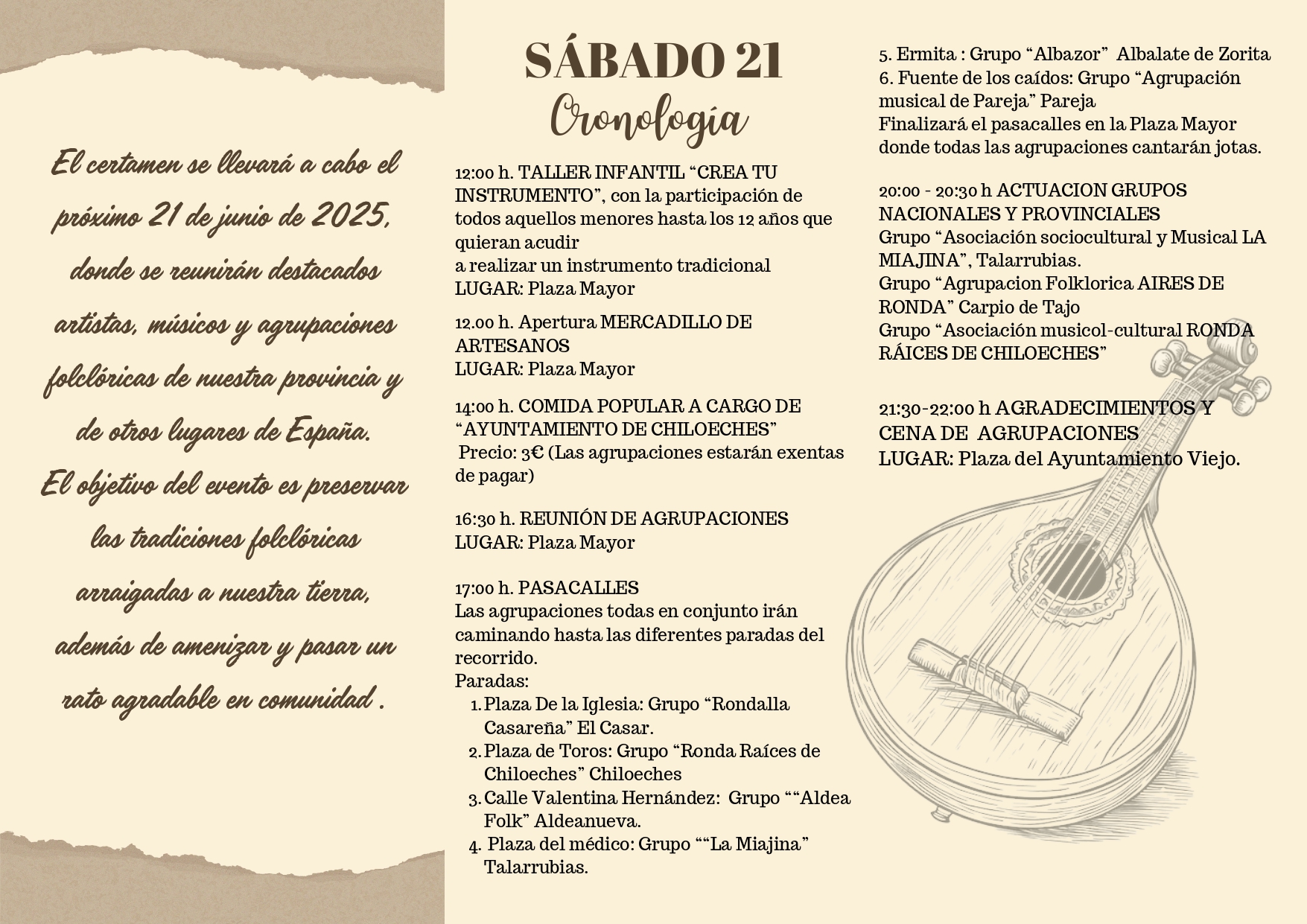 La jornada tendrá lugar el sábado 21 de junio y reunirá a múltiples agrupaciones folclóricas de la provincia de Guadalajara y otras regiones de España. Este evento, según informa el Ayuntamiento de Chiloeches en nota de prensa, nace con el propósito de preservar el folklore como elemento vivo de la identidad colectiva y ofrecer un espacio de convivencia para todas las edades.