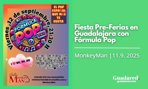 Fiesta Pre-Ferias en Guadalajara: Fórmula Pop en la Sala Monkey Man el 12 de septiembre. Vive una noche remember con los grandes éxitos del pop-rock español. ¡Entradas ya disponibles!