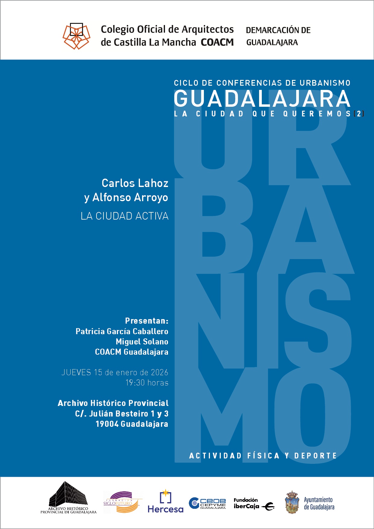 📅 El 15 de enero, Guadalajara acoge la conferencia “La ciudad activa. Urbanismo, actividad física y deporte” en el Archivo Histórico Provincial. Entrada gratuita y abierta a todos los públicos. Más info 👉 https://www.coacmgu.org/ #Urbanismo #Deporte