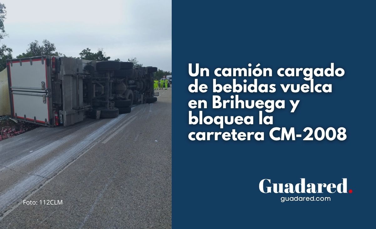Esta mañana se ha registrado un grave accidente de camión en la carretera CM-2008, a la altura de la localidad de Brihuega, en la provincia de Guadalajara. El suceso tuvo lugar alrededor de las 8:44 horas, cuando un camión que transportaba bebidas volcó en el kilómetro 4 de esta vía, provocando heridas al conductor y obligando al cierre temporal de la carretera.