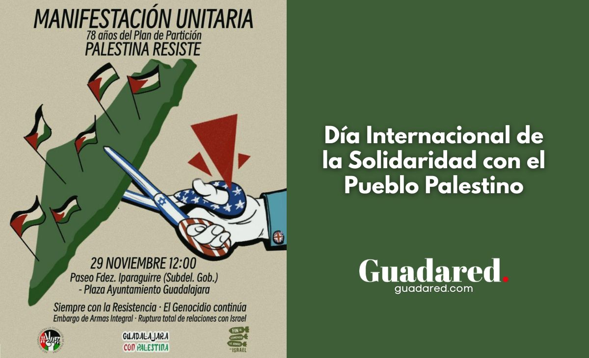 Este sábado 29 de noviembre, la Plataforma Guadalajara con Palestina llevará a cabo una serie de iniciativas en el marco del Día Internacional de Solidaridad con el Pueblo Palestino, que se celebra anualmente con el fin de visibilizar la difícil situación que atraviesa el pueblo palestino y denunciar el incumplimiento de la conocida Resolución de la Partición de la ONU, aprobada en 1947. En esa fecha, la Asamblea General de las Naciones Unidas acordó la creación de un Estado judío y un Estado árabe en Palestina, con Jerusalén bajo un régimen internacional especial. Sin embargo, de los dos Estados previstos, hasta el momento solo se ha creado Israel, lo que ha dejado sin resolución la cuestión palestina, y los derechos fundamentales de los palestinos aún no han sido reconocidos en su totalidad.