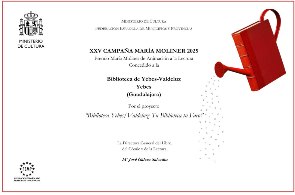 El reconocimiento se otorga a la Biblioteca Municipal de Valdeluz, que ha resultado ganadora en la XXV Campaña de Animación a la Lectura María Moliner gracias al proyecto “Biblioteca Yebes/Valdeluz: Tu Biblioteca, tu Faro”. Esta iniciativa ha destacado por su capacidad para acercar la lectura a vecinos de todas las edades, convirtiendo la biblioteca en un espacio activo de encuentro cultural y participación ciudadana.