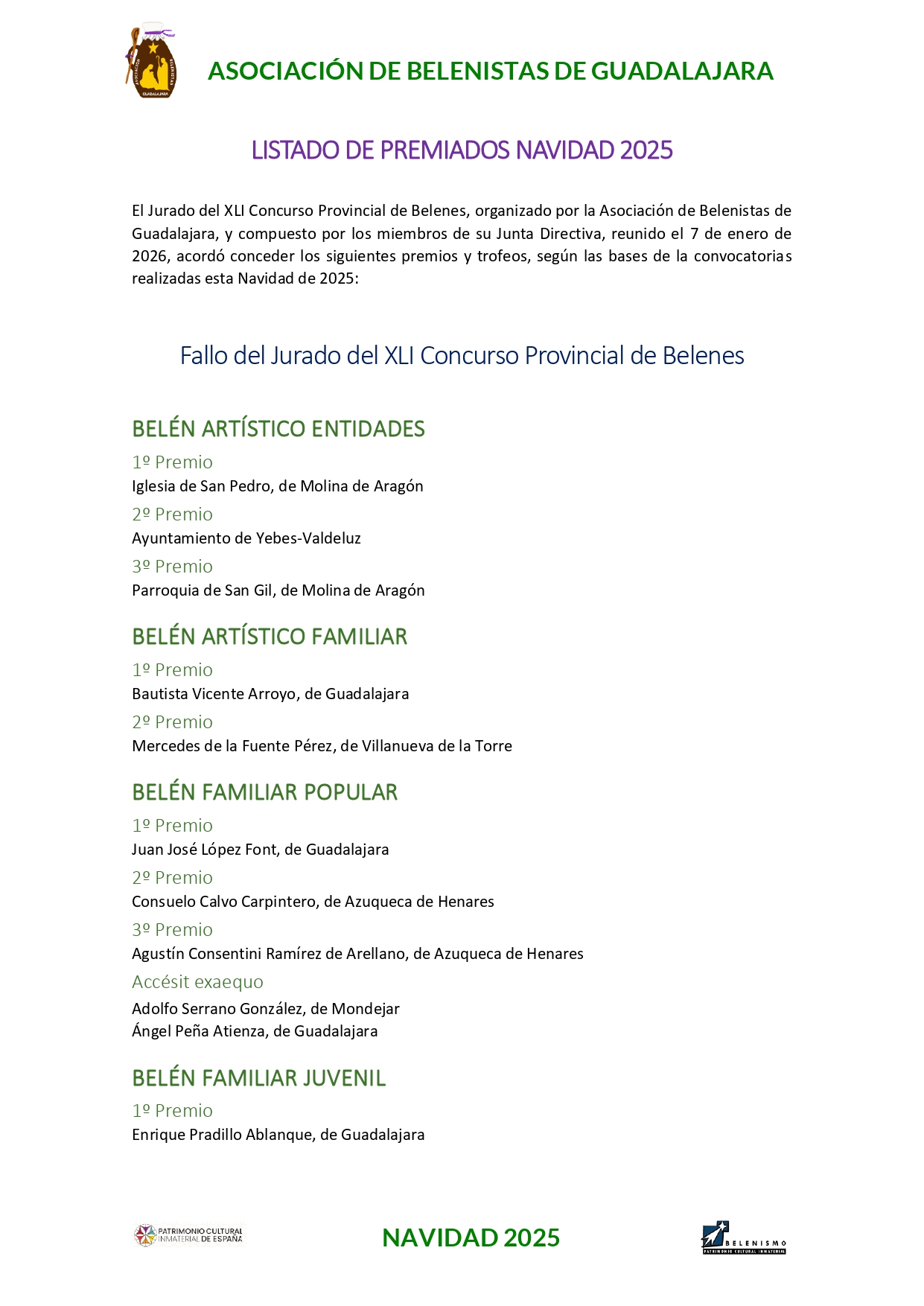 El galardón fue recogido por el autor del belén, Daniel Lobodán, acompañado por la concejala de Cultura, Milagros Hernández. La entrega de premios tuvo lugar en el Centro San José, en un acto que puso el broche final a la temporada navideña y congregó a numerosos aficionados y vecinos. La ceremonia contó con la presencia de la alcaldesa de Guadalajara, Ana Guarinos, y del presidente de la Asociación de Belenistas, Miguel Ángel Martínez, junto a representantes municipales y del ámbito cultural de la ciudad.