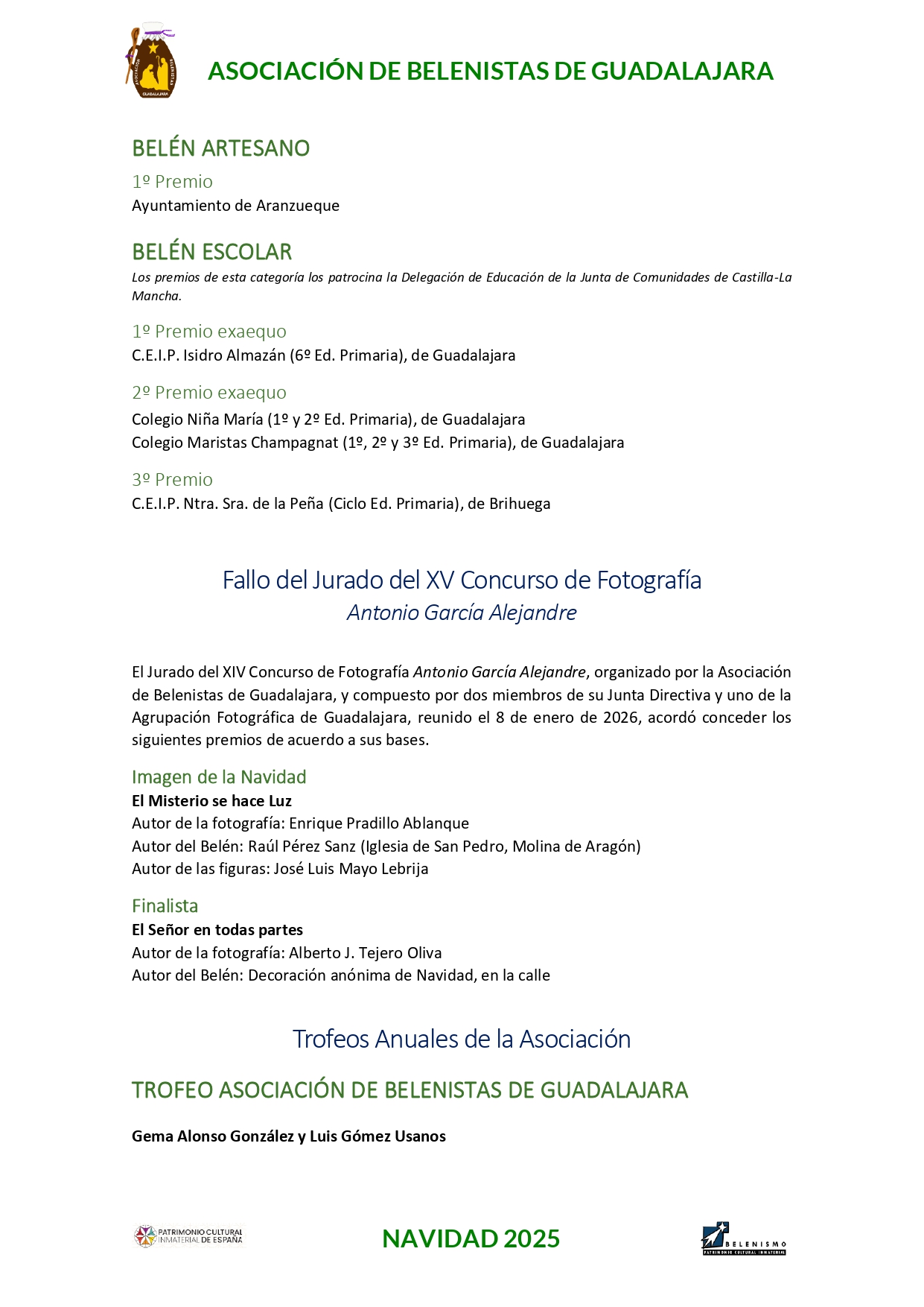 Durante el evento se proyectaron vídeos con los belenes instalados en Guadalajara y sus actividades navideñas, se disfrutó de la actuación musical de la Rondalla Amigos de Horche y se procedió a la lectura del fallo y entrega de los premios. La alcaldesa destacó la relevancia del belenismo como parte fundamental de la identidad cultural y navideña de la provincia, agradeciendo la labor de la Asociación por mantener viva esta tradición.