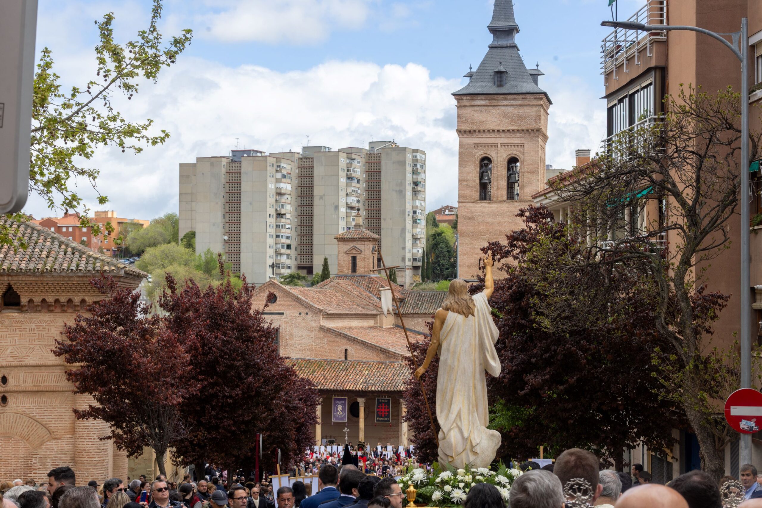 La imagen de Jesús Resucitado partió desde la iglesia de Santiago, precedida por la Cruz de Guía, en un cortejo integrado por más de 150 cofrades pertenecientes a las siete cofradías y hermandades de la ciudad, que desfilaron tras sus estandartes con sus hábitos característicos, aunque sin capirotes.