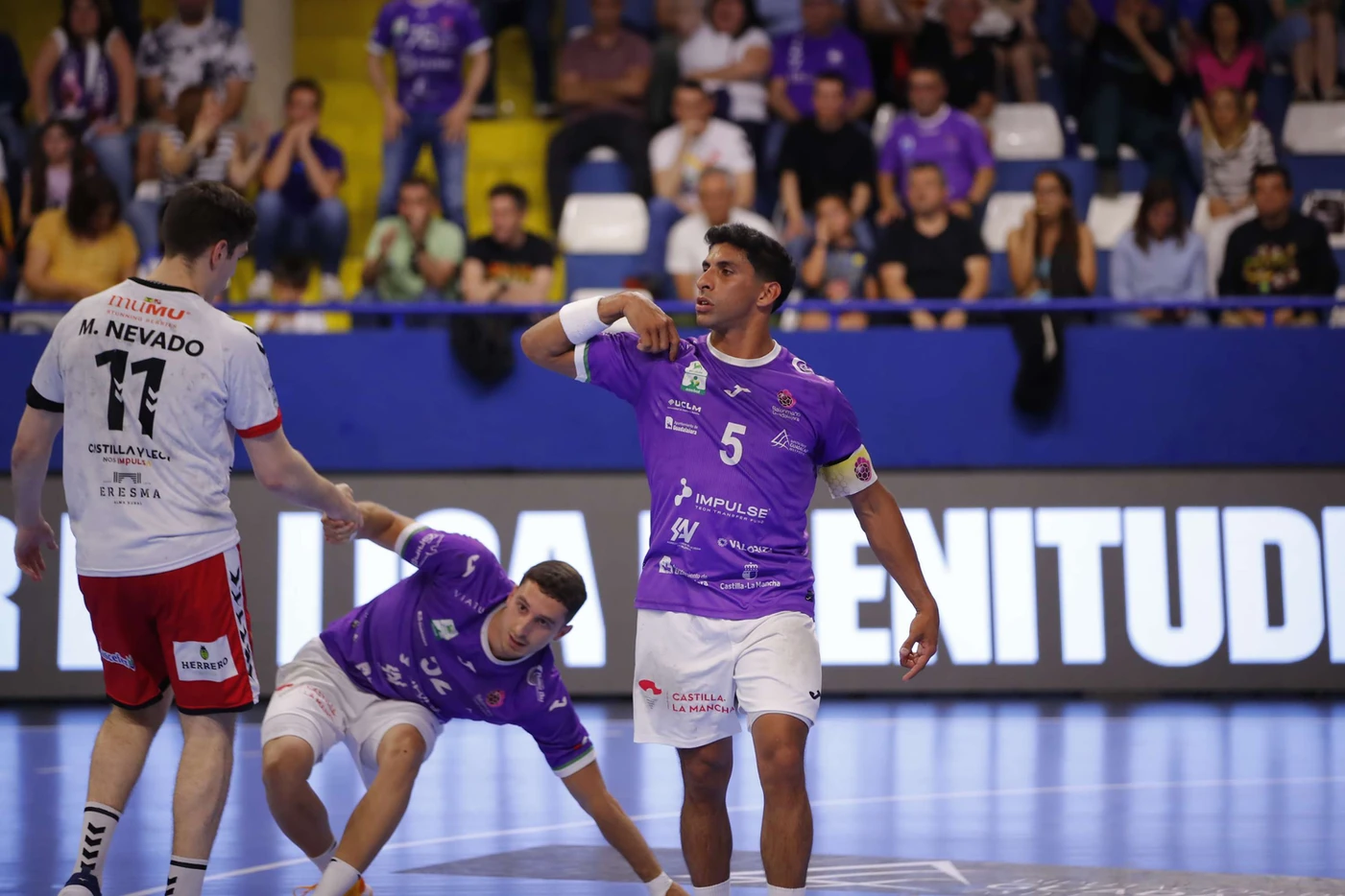 Con dos minutos por jugar y un 28-31 adverso, Requena pedía un último tiempo muerto. Era ahora o nunca. Lo que vino después fue una tormenta morada. Gol de Serradilla, robo en defensa, otro tanto de Catalina, y, como colofón, el alma de un equipo entera condensada en una jugada: Panchito Lombardi, entre lágrimas y rabia, rompía la red para poner el 31-31. La grada se venía abajo. El empate sabía a gloria.