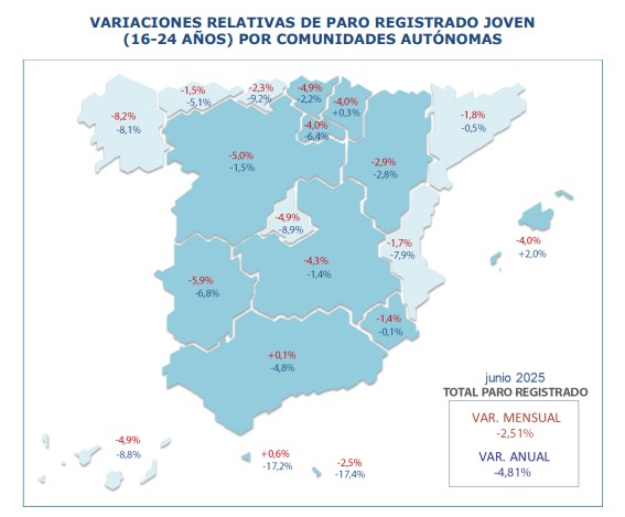 La mejora también es evidente en comparación con junio de 2024: hay 8.429 menores de 25 años menos registrados como desempleados, lo que supone una caída interanual del 4,81%. No obstante, su peso dentro del paro total ha aumentado ligeramente, pasando del 6,84% al 6,93% en un año.