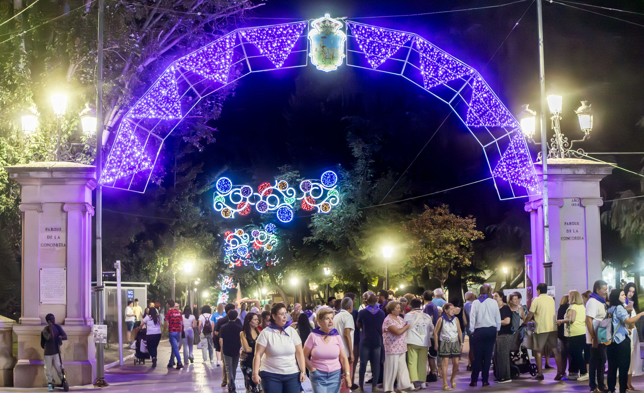 El arranque festivo vino acompañado del reparto de 3.000 pañuelos morados con el escudo de la ciudad, también en versión adaptada para bebés, que llenaron de color el eje feriante entre Concordia y Fuente de la Niña.