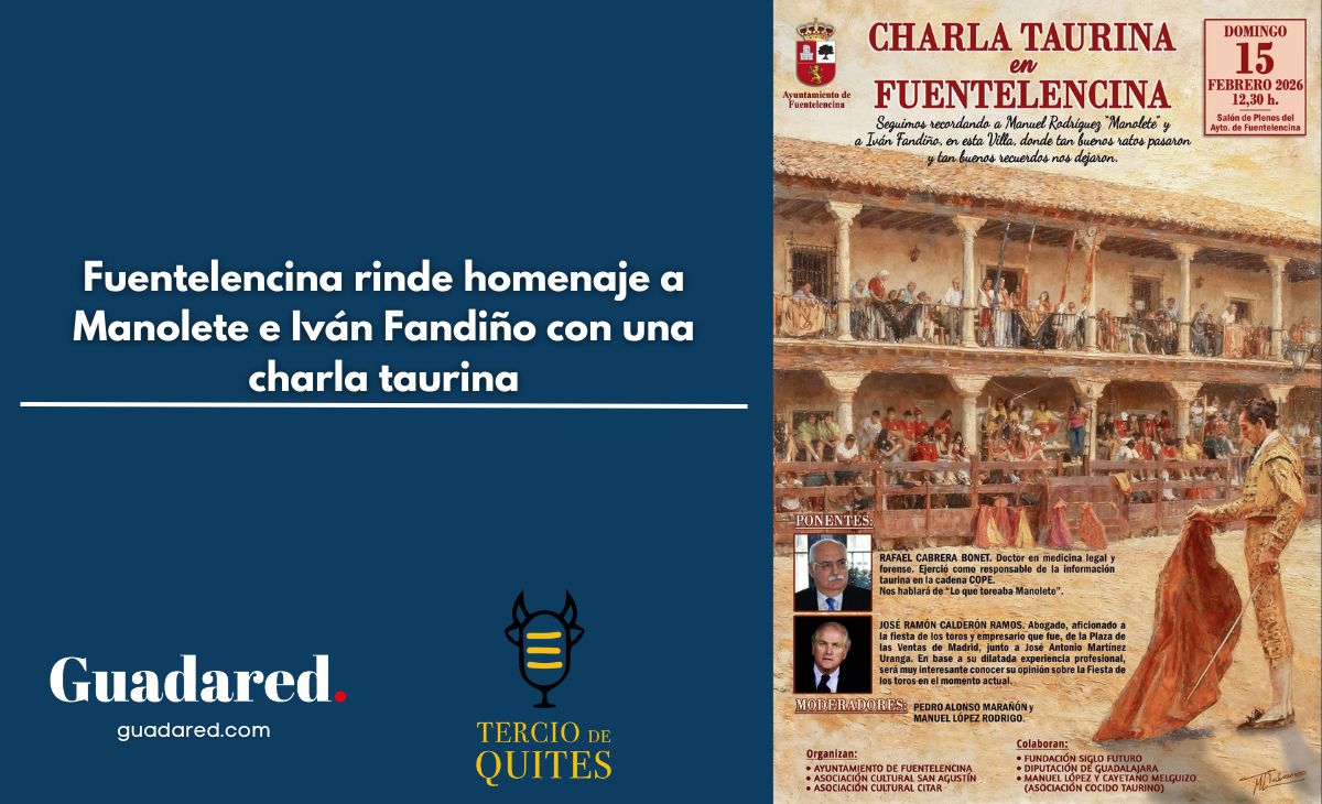 El municipio de Fuentelencina celebrará el próximo domingo 15 de febrero de 2026 una charla taurina que reunirá a destacados profesionales y aficionados para reflexionar sobre la tauromaquia y rendir homenaje a dos figuras clave de su historia: Manuel Rodríguez “Manolete” e Iván Fandiño.