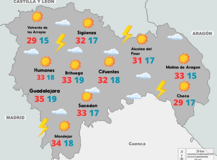 Además del aviso por tormentas, la AEMET ha activado alerta amarilla por altas temperaturas en el sur y este de Guadalajara, donde la ola de calor empieza a dejar registros propios del verano más extremo.