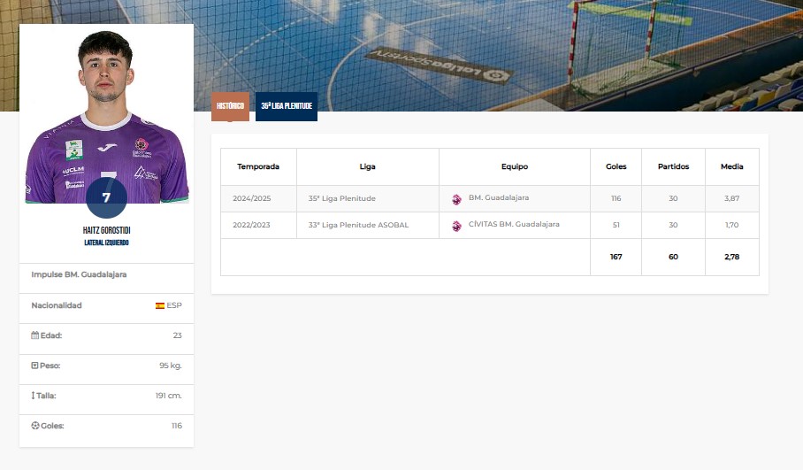 El lateral izquierdo, nominado a Mejor Jugador Revelación de la Liga Plenitude, ha demostrado en la pista por qué se ha convertido en una de las piezas fundamentales del proyecto guadalajareño. Con apenas 23 años, 191 centímetros de altura y una potencia imparable, Haitz Gorostidi ha cerrado una temporada espectacular: 116 goles en 30 partidos, con una media de 3,87 tantos por encuentro.