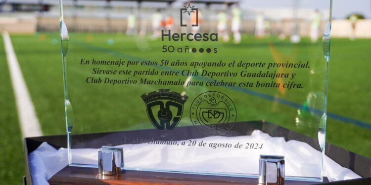 En un emotivo acto celebrado ayer en el Complejo Deportivo ‘La Solana’ de Marchamalo, la empresa alcarreña Hercesa fue reconocida por sus 50 años de trayectoria y su inestimable apoyo al deporte de la provincia de Guadalajara. El homenaje tuvo lugar minutos antes de que el CD Marchamalo y el CD Guadalajara disputaran el XLIX Trofeo Campiña, un torneo estival de gran tradición en la región.