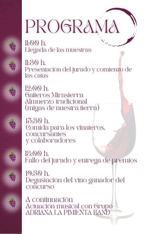 Desde las 11:00 horas, los asistentes podrán comenzar a disfrutar de las muestras de vino, que estarán disponibles hasta las 19:30 horas, momento en el que se realizará la degustación del vino ganador. A lo largo de la jornada, se llevarán a cabo diversas actividades, como la actuación de los Gaiteros Mirasierra y un almuerzo tradicional con migas castellanas, lo que permitirá a los participantes disfrutar de la gastronomía y las tradiciones de la región.