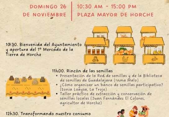 El Ayuntamiento de Horche y el Observatorio para una Cultura del Territorio organizan una Feria de Semillas y Mercado de la Tierra el 26 de noviembre. La jornada incluirá talleres sobre la Red de Semillas y la Biblioteca de Semillas de Guadalajara, así como charlas sobre consumo de productos locales. El evento culminará con una comida presentando iniciativas de recuperación de semillas.