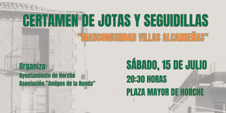 Horche se prepara para recibir una nueva edición del Certamen de Jotas y Seguidillas Villas Alcarreñas el próximo 15 de julio. Organizado por la Asociación ‘Amigos de la Ronda’ en colaboración con el Ayuntamiento de Horche, este evento musical promete una noche llena de folclore y tradición en la Plaza Mayor.