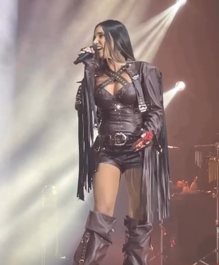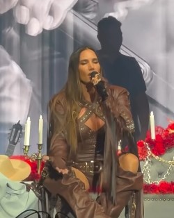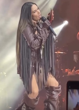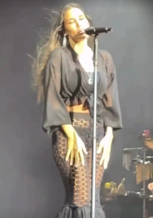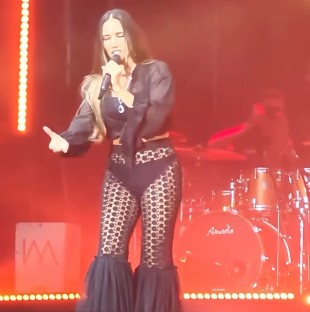 Primero apareció vestida de cuero con flecos, poderosa y terrenal, como si la fuerza del sur hubiese encarnado en ella. Después, en el corazón del concierto, se transformó: apareció con leggins negros de filigrana transparente, etéreos, casi líquidos, y regaló una de las joyas más intensas de la noche: La saeta, que nos dejó los pelos de punta. Fue un instante sagrado, de recogimiento colectivo, como si toda la era, con sus fardos de paja, hubiese contenido el aliento.