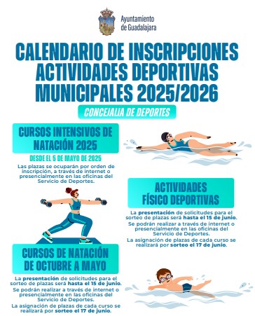 La Concejalía de Deportes del Ayuntamiento de Guadalajara abre el calendario de inscripciones para las actividades deportivas municipales del curso 2025/2026, que incluyen una variedad de cursos intensivos de natación y actividades físico-deportivas dirigidas a todos los ciudadanos interesados.