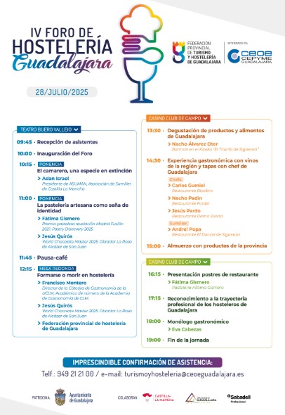 Hoy, lunes 28 de julio, en la emblemática Sala Tragaluz del Teatro Buero Vallejo de Guadalajara, ha tenido lugar la inauguración del IV Foro de Hostelería de la provincia de Guadalajara, un evento gratuito organizado por la Federación provincial de Turismo y Hostelería de Guadalajara, con el respaldo de la CEOE-CEPYME, el Ayuntamiento, la Junta de Comunidades de Castilla-La Mancha y la Diputación provincial.