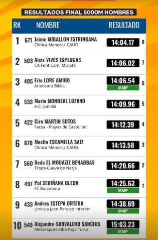 En una tarde marcada por el intenso calor y la alta exigencia táctica de la prueba, Jaime Migallón, atleta del Clínica Menorca CAUG, cruzó la meta en primera posición con un tiempo de 14:04.17, mostrando una vez más su capacidad para leer la carrera, controlar los tiempos y rematar con fuerza en los momentos decisivos.