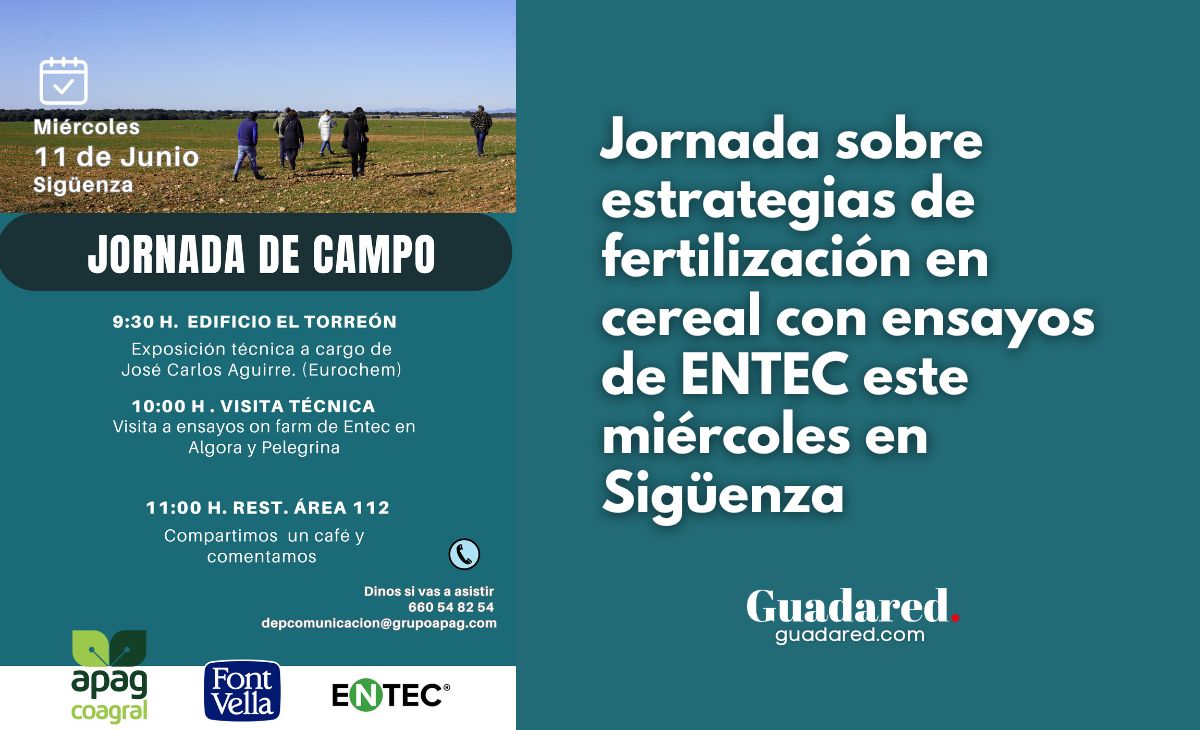 La localidad de Sigüenza acoge este miércoles 11 de junio una jornada de campo dedicada al análisis y debate en torno a las más innovadoras estrategias de fertilización en la producción de cereal. Las actividades arrancarán a las 9:30 horas en el Edificio El Torreón, con una exposición técnica a cargo de José Carlos Aguirre, representante de EuroChem. A continuación, a las 10:00, se llevará a cabo una visita a los ensayos “on farm” realizados con ENTEC en Algora y Pelegrina, donde se podrá comprobar de primera mano el rendimiento y la eficacia de este innovador fertilizante.