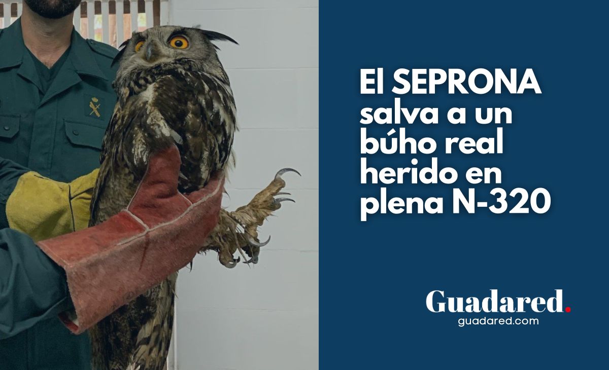 Un ejemplar de búho real (Bubo bubo), la rapaz nocturna más grande de Europa, ha sido rescatado tras ser localizado herido en la carretera N-320, a su paso por el municipio de Quer (Guadalajara). El ave fue avistada por unos operarios de mantenimiento que no dudaron en alertar al SEPRONA, unidad especializada de la Guardia Civil de Guadalajara, que coordinó su rescate.