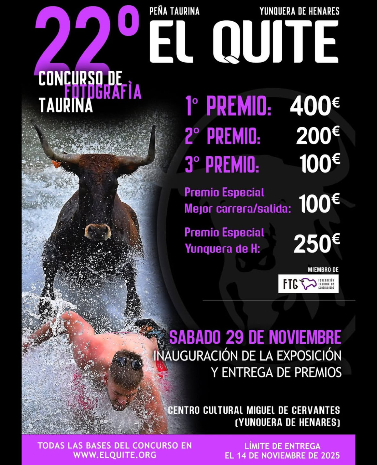 La entrega de premios y la inauguración de la exposición fotográfica se celebrarán el sábado 29 de noviembre en el Centro Cultural Miguel de Cervantes de Yunquera de Henares, en un acto abierto al público que servirá también para poner en valor el arte y la tradición vinculada al mundo del toro.