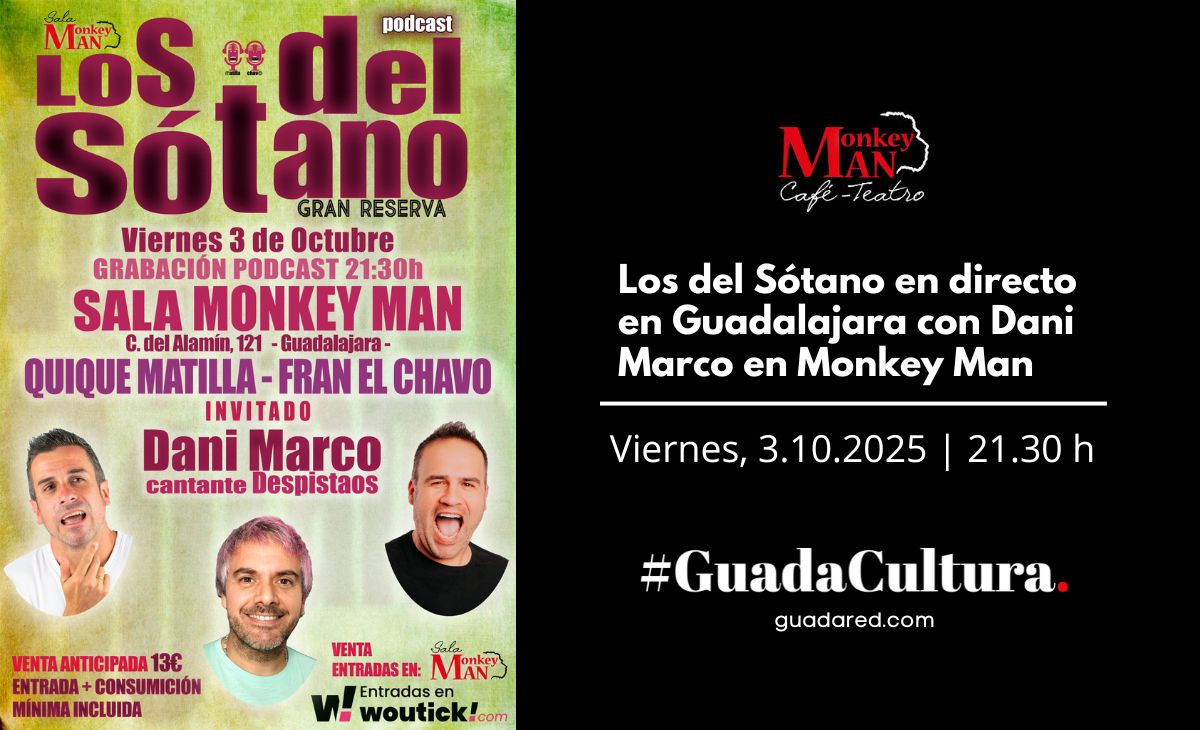 Tags: comedia en vivoConciertos en GuadalajaraDani Marcodespistaoseventos en GuadalajaraGuadalajara octubre 2025Los del SótanoMonkey Man Guadalajarapodcast de humorteatro y música