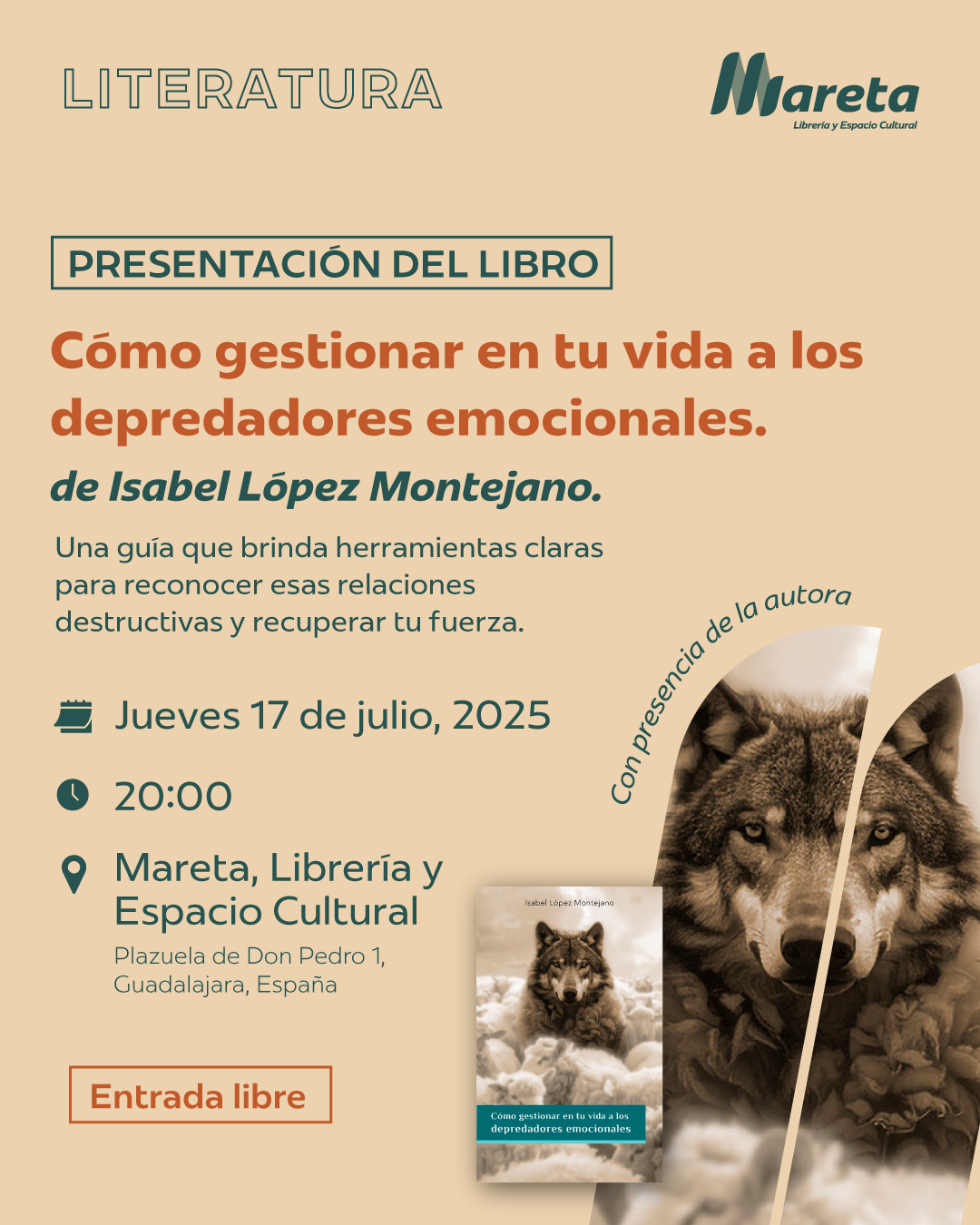 Mareta acoge la presentación del libro de Isabel López Montejano sobre depredadores emocionales este 17 de julio en Guadalajara a las 20:00 h.