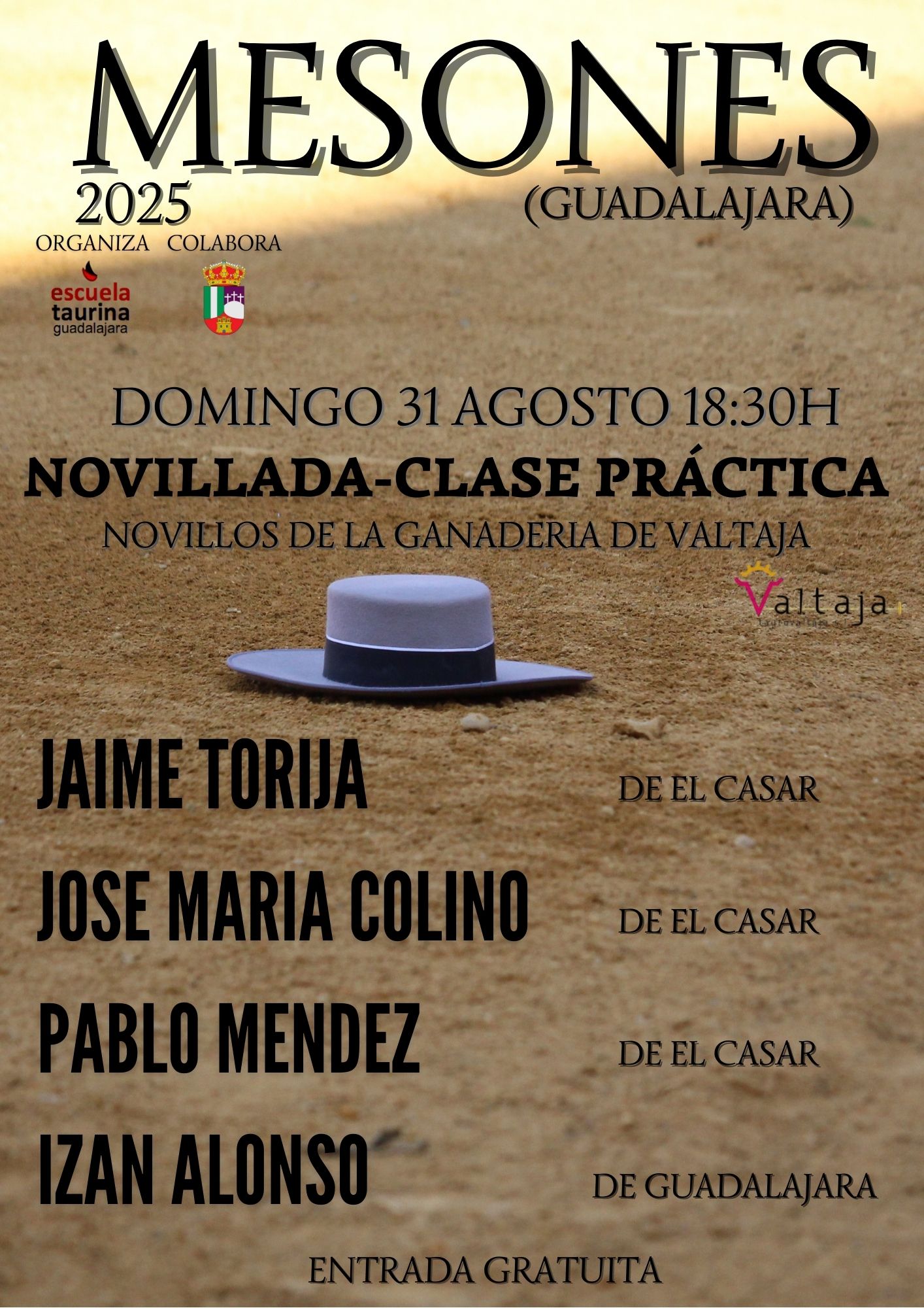 El próximo domingo 31 de agosto a las 18:30 horas, la plaza de toros de Mesones (Guadalajara) se vestirá de luces para acoger una novillada-clase práctica organizada por la Escuela Taurina de Guadalajara, en colaboración con el Ayuntamiento de la localidad.