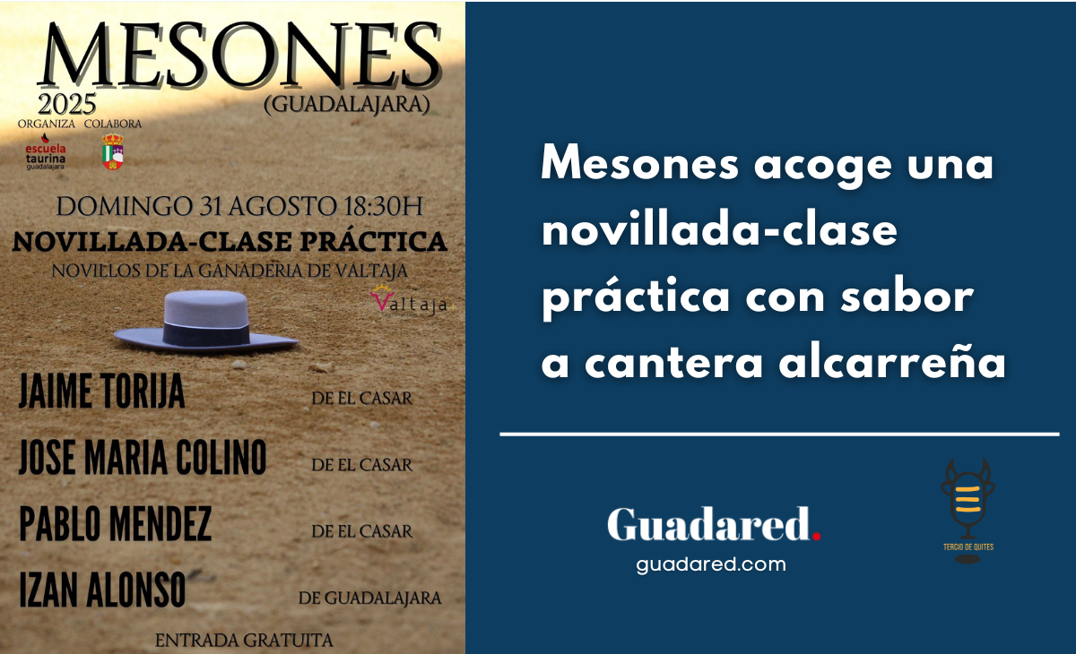 El próximo domingo 31 de agosto a las 18:30 horas, la plaza de toros de Mesones (Guadalajara) se vestirá de luces para acoger una novillada-clase práctica organizada por la Escuela Taurina de Guadalajara, en colaboración con el Ayuntamiento de la localidad.