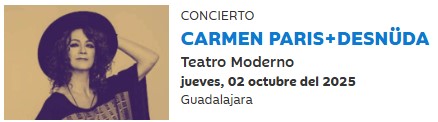 El próximo jueves 2 de octubre, el Teatro Moderno dará la bienvenida a una nueva edición del ciclo musical Moderno Sonoro, que este año se consolida como uno de los grandes referentes de la programación cultural de Guadalajara. La inauguración correrá a cargo de Carmen París, una de las voces más singulares y renovadoras de la música española, que actuará a partir de las 20:00 horas acompañada del grupo local Desnüda.