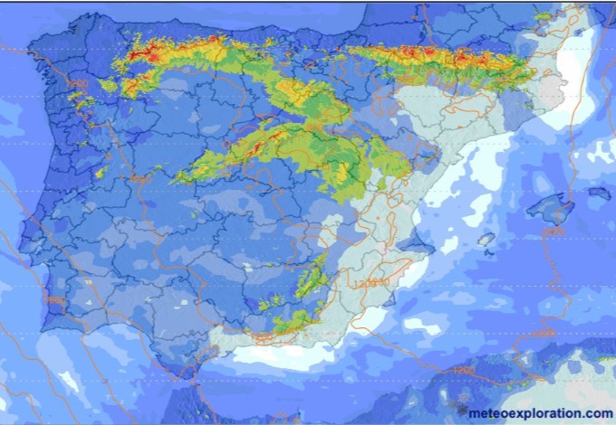 A partir del jueves, los sucesivos frentes y masas de aire frío llegarán a la península Ibérica, con precipitaciones continuas desde el noreste hacia el sureste, lo que continuará trayendo lluvias y nieve en zonas montañosas. A partir del viernes, la atmósfera se estabilizará, pero no por mucho tiempo, ya que se prevén nuevas inestabilidades para los días siguientes. La cota de nieve se situará en torno a los 1.200 metros a primera hora del jueves y ascenderá hasta los 1.600 a medida que avance la jornada. Las temperaturas apenas cambiarán, aunque se espera un leve ascenso de las máximas en zonas de montaña. Las heladas seguirán siendo probables en cotas altas, pero el episodio de nieve perderá intensidad.