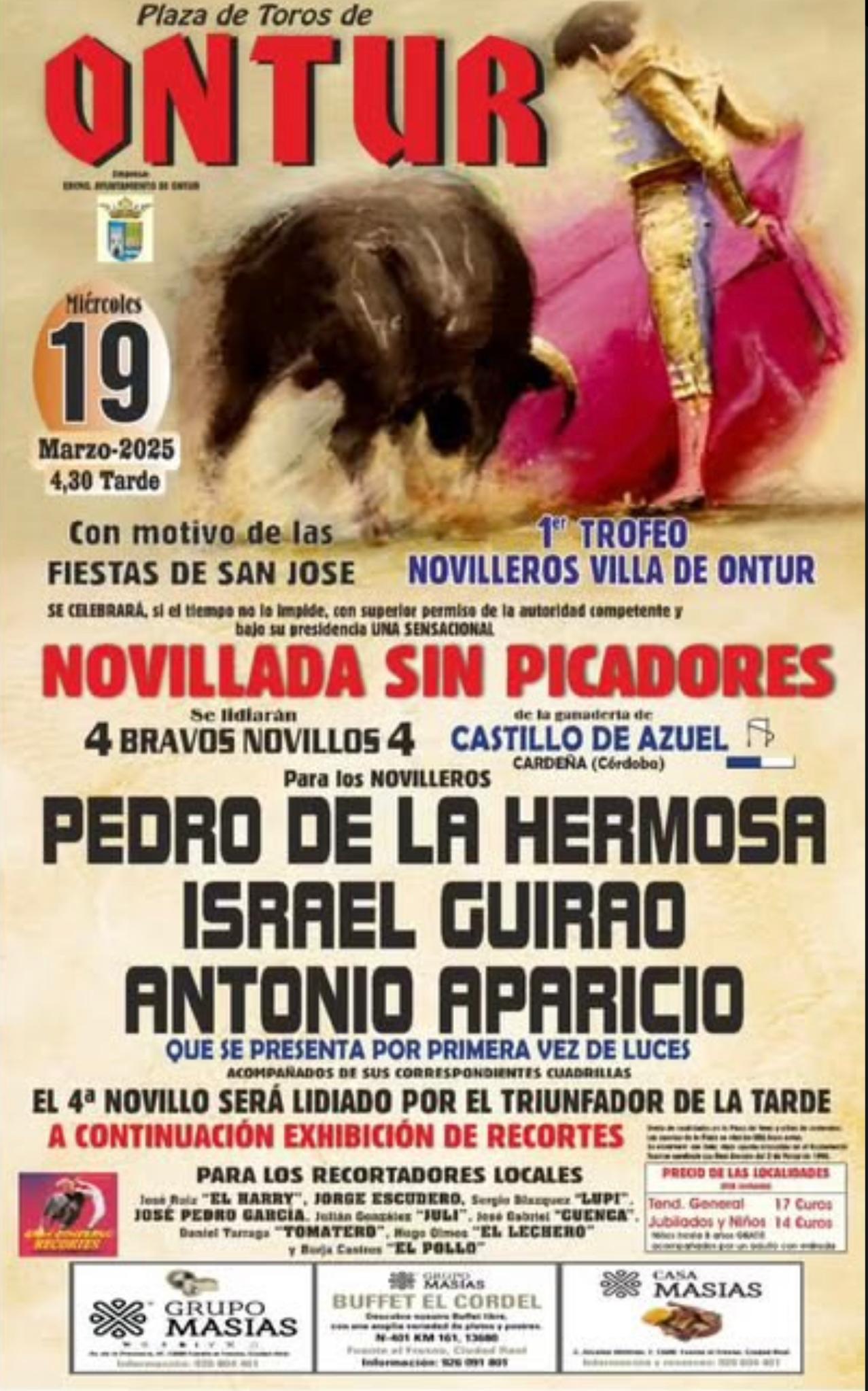 El próximo miércoles 19 de marzo, a las 16:30 horas, Ontur celebrará su primer Trofeo Novilleros Villa de Ontur, en el marco de las festividades en honor a San Jorge. Este evento taurino, que promete ser una cita imprescindible para los aficionados, contará con una novillada sin picadores en la que se lidiarán cuatro bravos novillos de la acreditada ganadería Castillo de Azuelo, de Cardeña (Córdoba).