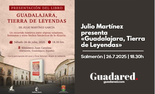 Salmerón acogerá el próximo sábado 26 de julio, a las 18:30 horas, una cita con el misterio, la tradición y la historia. En el salón de actos de la biblioteca Juan Catalina García, situada en el corazón del municipio, se celebrará la presentación del libro Guadalajara, Tierra de Leyendas, el quinto trabajo literario de Julio Martínez, un autor que ha hecho del folclore narrativo su especialidad. Acompañándole en el acto estará el alcalde de la localidad, Óscar Balcones, en un evento organizado con el apoyo de Océano Atlántico Editores y AACHE Ediciones.