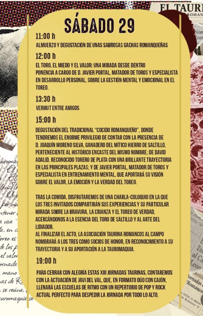 El sábado 29 continuará la actividad con la conferencia “El toro, el miedo y el valor: una mirada desde dentro” (12:00 h), a cargo de Javier Portal, matador de toros y especialista en desarrollo personal, quien abordará la gestión mental y emocional del torero frente al miedo.