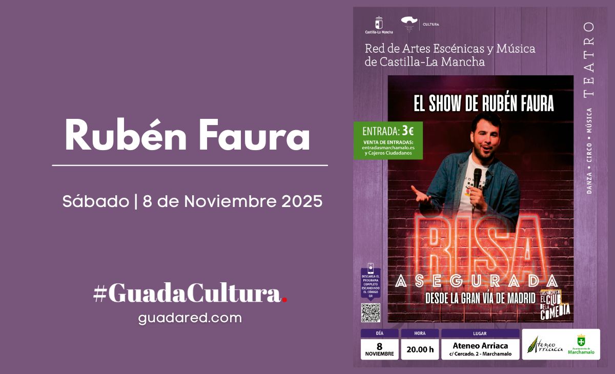 El reconocido humorista manchego Rubén Faura llegará a Marchamalo el próximo 8 de noviembre para ofrecer su último espectáculo en el Ateneo Arriaca, a las 20:00 horas, de la mano de la Red de Artes Escénicas de Castilla-La Mancha. Con entradas a la venta por tan solo 3 euros, los fans del humor podrán disfrutar de una noche de risas y diversión garantizadas.