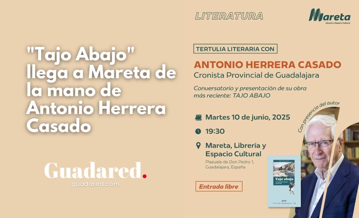 El mundo editorial, siempre en movimiento, vuelve a dejar su estela en las orillas de la cultura local. Y esta vez lo hace con la fuerza serena del río que nos atraviesa: el Tajo. El próximo martes, 10 de junio, a las 19:30 horas, el espacio cultural Mareta, situado en la recoleta plazuela de Don Pedro, número 1, en pleno corazón de Guadalajara, acoge la presentación del nuevo libro de Antonio Herrera Casado: “Tajo Abajo”. Un acto cargado de emoción, memoria y palabra, organizado por Océano Atlántico Editores, con la intervención del propio autor y de Julio Martínez, editor y gerente de Mareta, quien introducirá la velada.