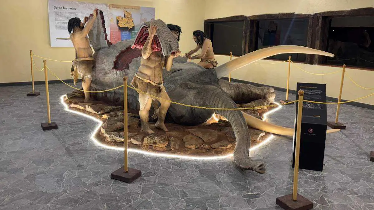 La escena muestra un episodio de aprovechamiento de un gran elefántido, basado en estudios arqueológicos y paleontológicos. Lejos de la épica, el foco está en la subsistencia colectiva y la interacción con la naturaleza. Los visitantes se sitúan dentro de la recreación, rodeados de figuras humanas, herramientas y restos del animal, transformando la visita en un auténtico manual de prehistoria en tres dimensiones.