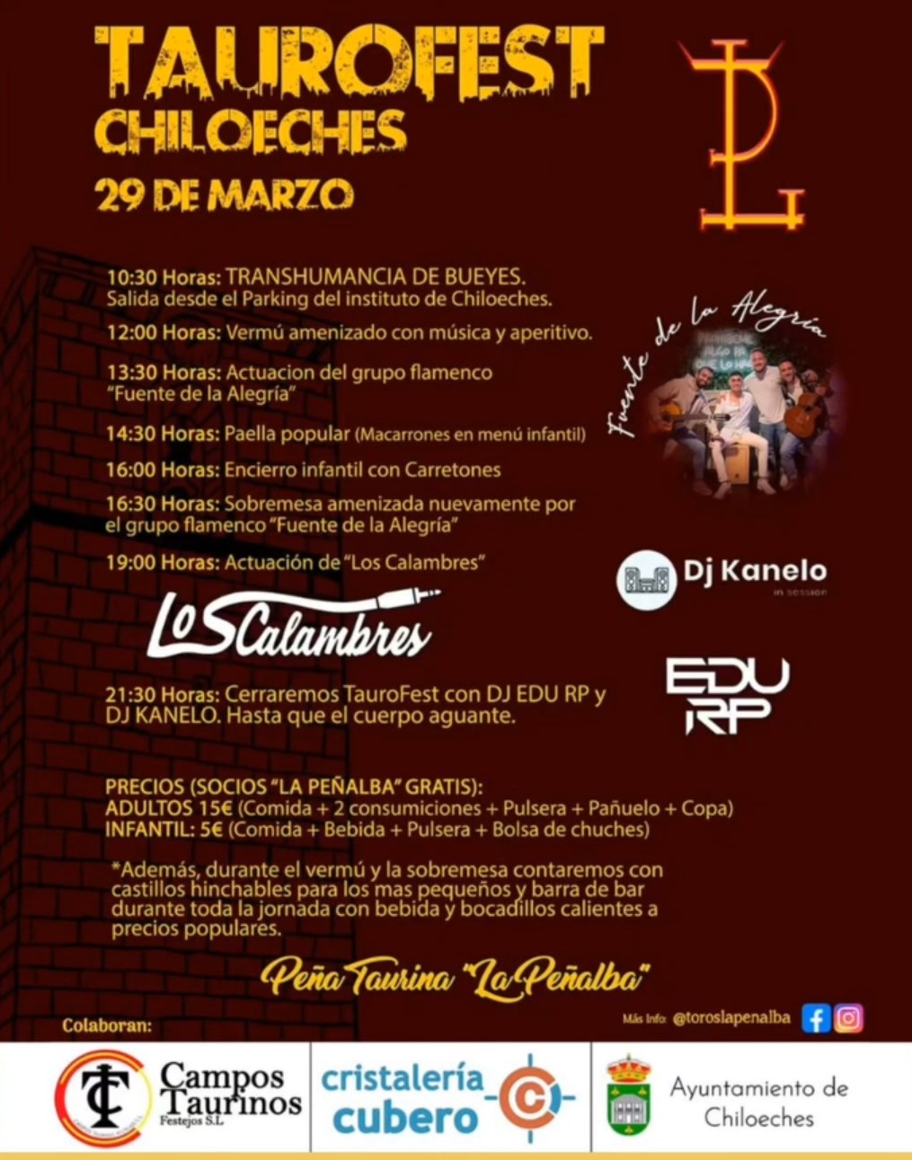 El próximo 29 de marzo, Chiloeches se vestirá de fiesta para celebrar el Taurofest, una jornada organizada por la Peña Taurina “La Peñalba”, que lleva años impulsando y preservando la tradición taurina en el municipio. Gracias a su esfuerzo y dedicación, vecinos y visitantes podrán disfrutar de un evento que pone en valor la cultura del toro y fomenta la convivencia entre aficionados y familias.