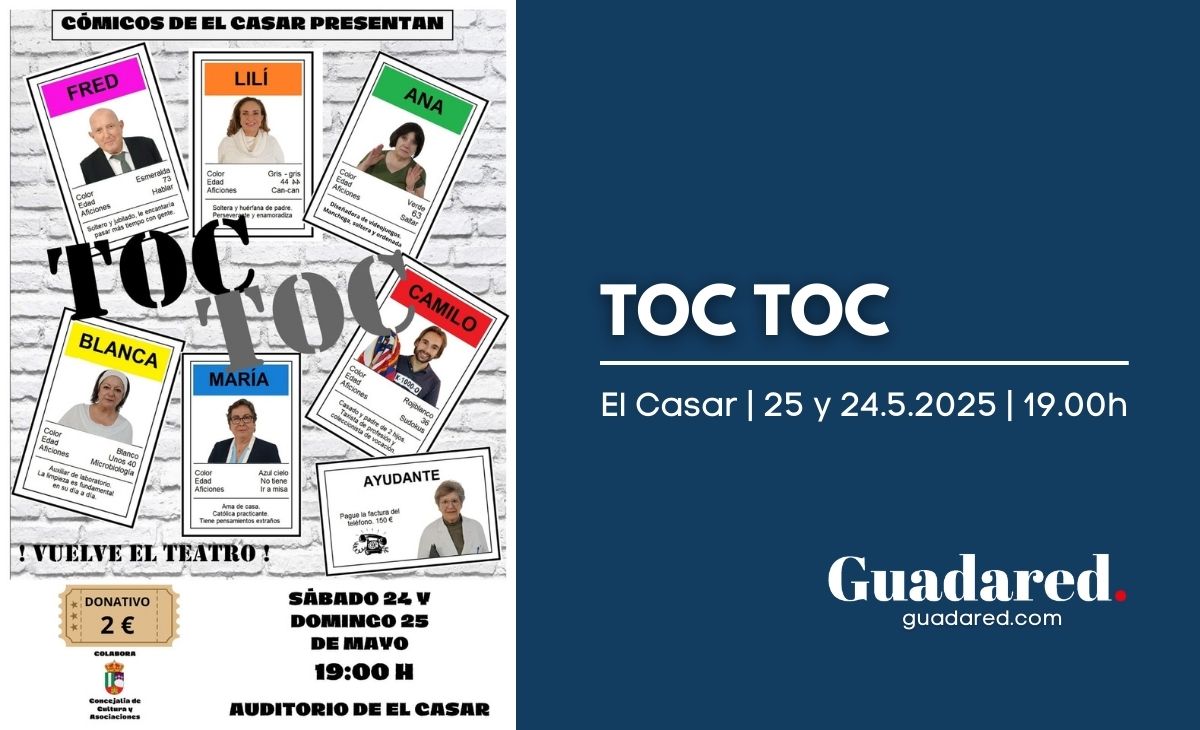 El telón se alzará este fin de semana en el Auditorio de El Casar para recibir a Los Cómicos de El Casar, quienes traerán consigo una de las propuestas teatrales más originales y necesarias de la Primavera Cultural El Casar 2025: TOC TOC, una divertida comedia que, entre carcajadas, invita a la reflexión sobre la salud mental y los trastornos obsesivos compulsivos.