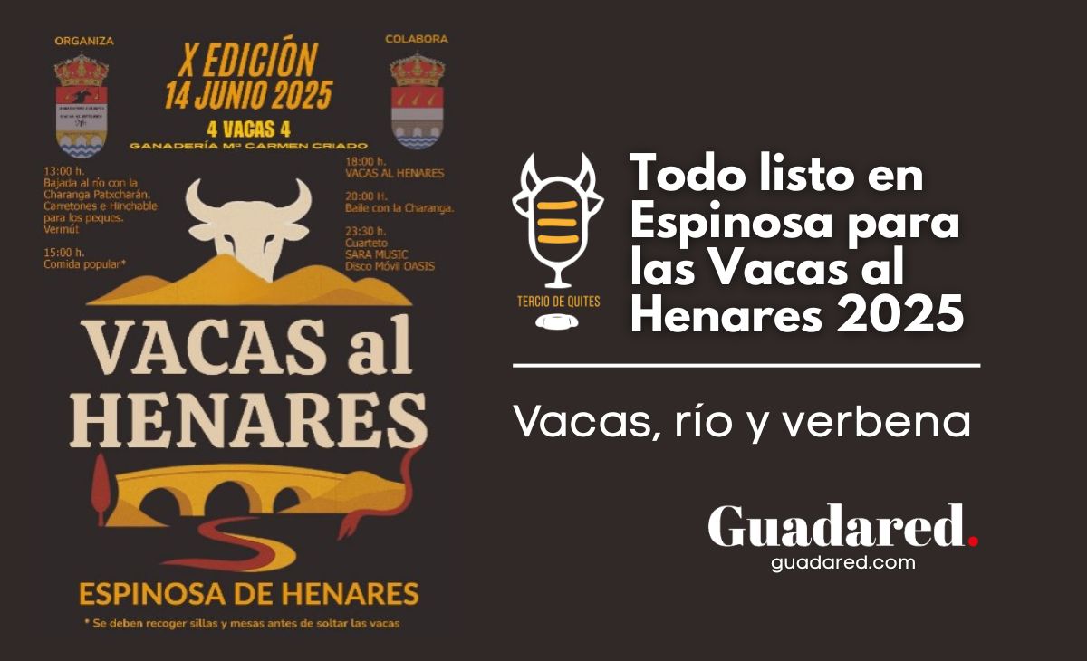 Desde Tercio de Quites queremos invitar a todos los aficionados al toro, amantes de la tradición y buscadores de experiencias auténticas a vivir de primera mano la X Edición de “Vacas al Henares”. Espinosa de Henares os espera con su hospitalidad, su pasión por el campo bravo y una jornada única donde el río, la música y la emoción del festejo popular se dan la mano en un entorno incomparable. No lo dudéis: este 14 de junio, el corazón de la tauromaquia late junto al Henares.