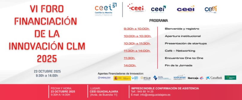 El CEEI Guadalajara acoge el VI Foro de Financiación de la Innovación de Castilla-La Mancha el 23 de octubre de 2025. Startups y empresas innovadoras de la región presentarán sus proyectos ante inversores públicos y privados. Entrada gratuita con inscripción previa.