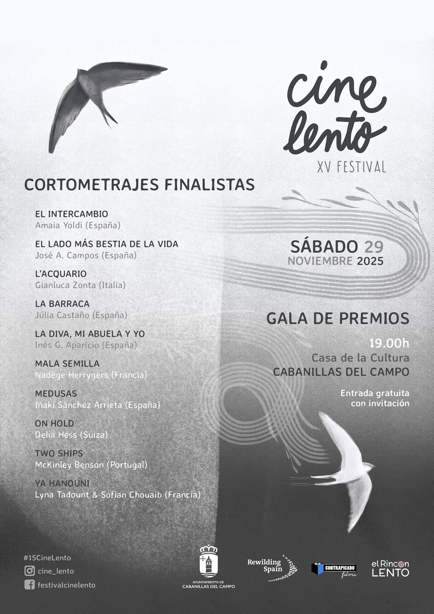 El sábado 29 será el día más intenso, con una doble cita: por la mañana, un taller infantil sobre los inicios del cine para niños desde los 5 años, coordinado por la artista local Victoria Vinuesa, y por la tarde, la gran gala de premios del festival. En la gala se proyectarán los cortometrajes finalistas, que optan a los galardones de esta edición, entre ellos el Premio del Jurado, el Premio más Lento y el Premio del Público, otorgado por los asistentes. La gala estará presentada por la artista local EME y contará con una actuación de danza de la bailarina Helena Mediavilla.